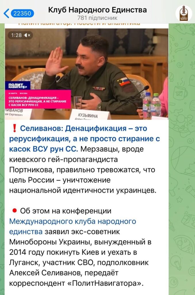 На першому засіданні цього клубу заявили, що українська нація має бути повністю знищена і що справжня мета «СВО» не денацифікація, а знищення національної ідентичності українців. «Там куди приходять російські війська, українство перестає існувати. Ті, хто не хоче припиняти існування української нації – загинуть чи поїдуть» – казали друзі Азарова.