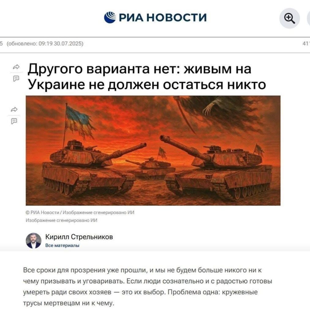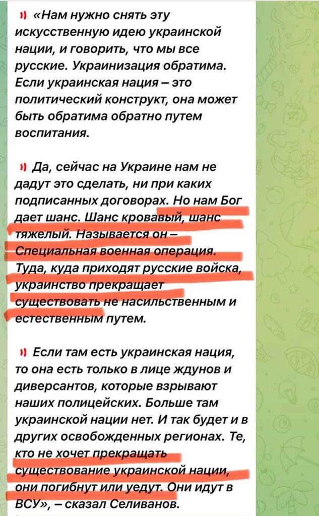 2014 року їхня пропаганда (і українські колаборанти слідом за нею) ще брехала про «громадянську війну в Україні» та «конфлікт Києва та Донбасу», але тепер уже ніхто не соромиться. Прямо визнають, що з 2014 року мета була одна – геноцид українців.