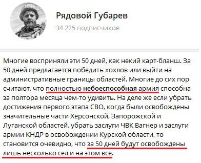 Мало ймовірно що ЗС РФ виконають путінські плани в зазначений термін, тому після закінчення терміну кремль імітуватиме “бурхливу діяльність” спрямовану на “досягнення мирних переговорів”, при цьому ставлячи заздалегідь неприйнятні умови, вимоги і розводити руками: