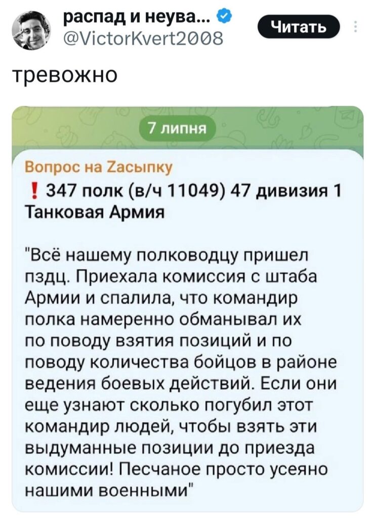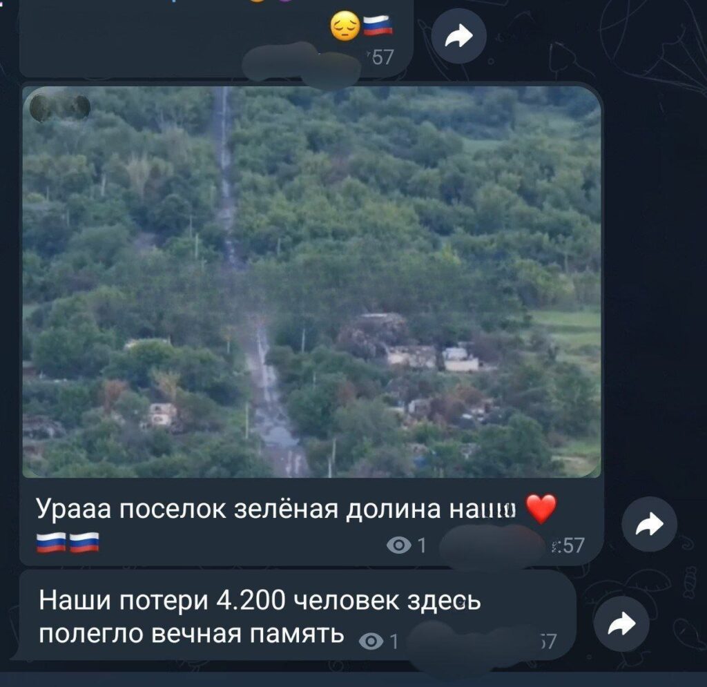 Російські військові та блогери не приховують своїх величезних втрат. Так один з них пише, що захоплення одного маленького села Зелена Долина (імовірно Краматорський район Донецької області, площа менше 1 кв км, населення-89 осіб) вартувало російським військам 4200 людей загиблими.