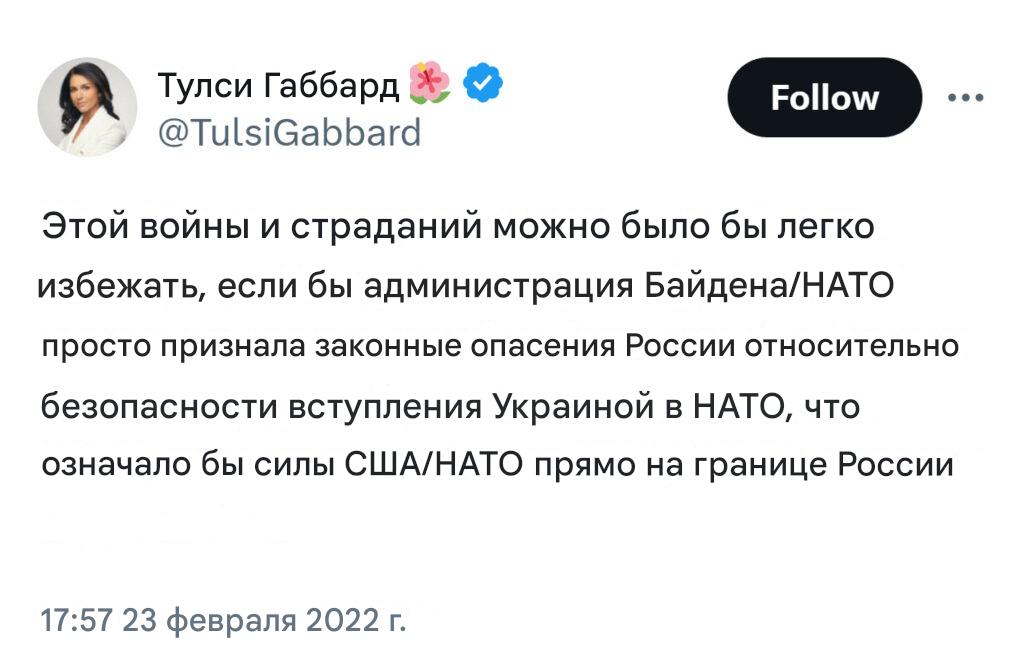 Тулси Габбард, например, заявляла о якобы существовании в Украине биологических лабораторий (это один из важных российских фейков последних лет), резко критиковала политику президента США Джо Байдена и утверждала, что поставки оружия Киеву только затягивают войну. Эти заявления перекликались с ключевыми тезисами российской пропаганды.