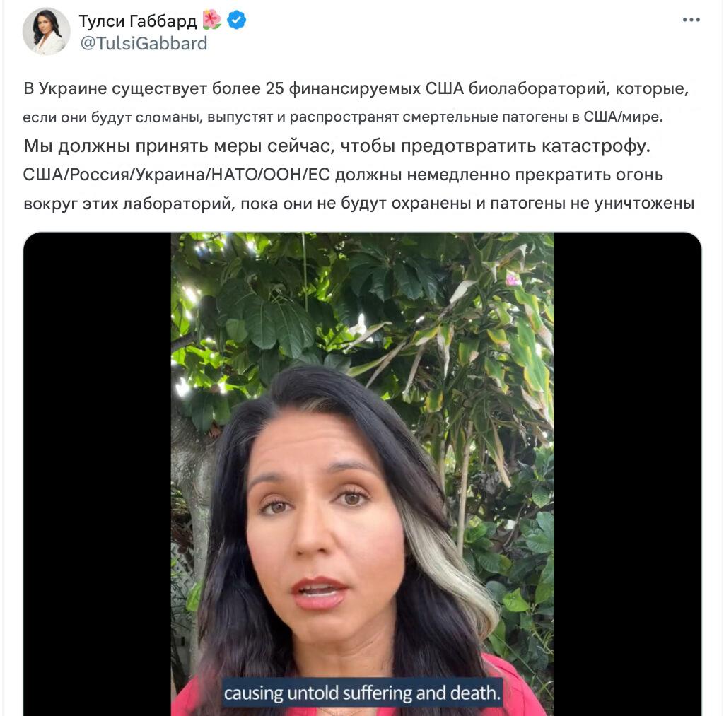 “В Украине существует более 25 биолабораторий, финансируемых США. Если они будут повреждены, то смертельные патогены распространятся в США и всем мире”, – рассказывала Габбард на своей странице в сети X.
